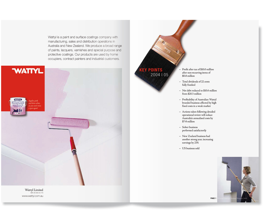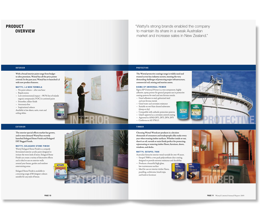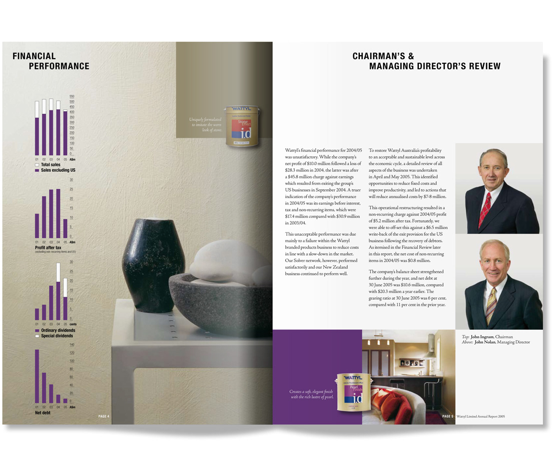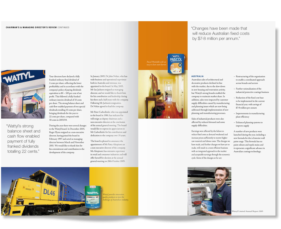 Wattyl is a paint and surfaces coatings company based in Australia and New Zealand. I designed and artworked their annual report. Below is some samble spreads from the 2005 report.