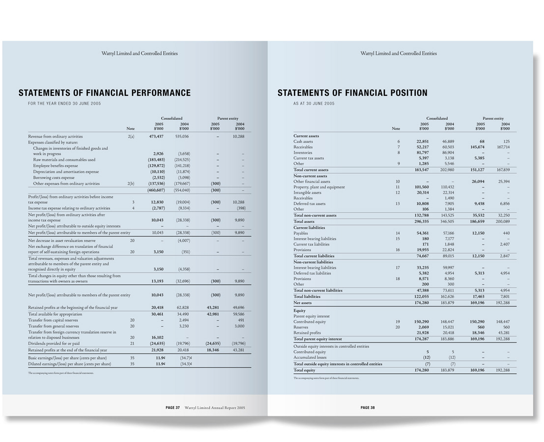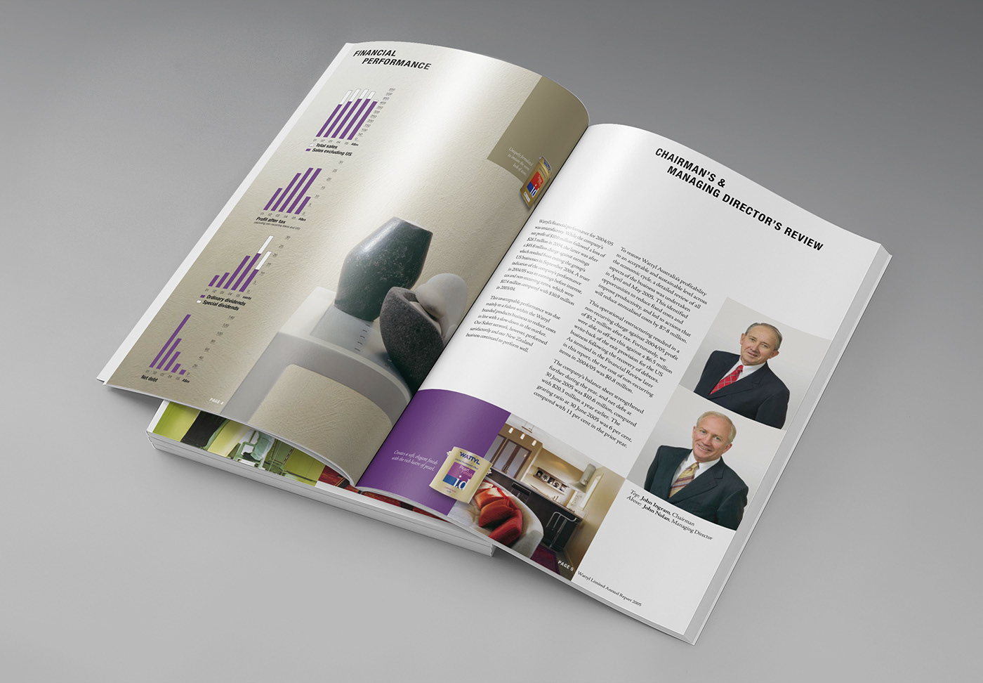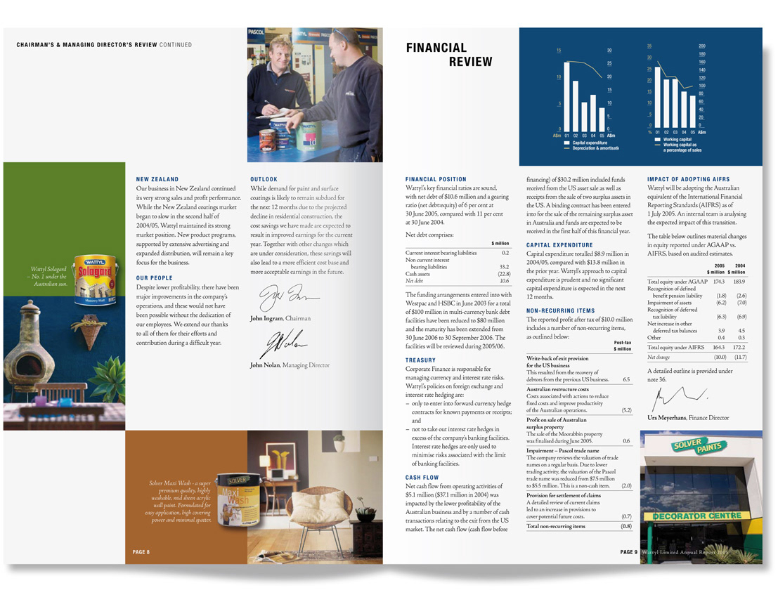 Wattyl is a paint and surfaces coatings company based in Australia and New Zealand. I designed and artworked their annual report. Below is some samble spreads from the 2005 report.